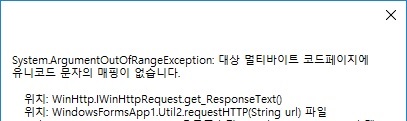 - C#에서 WinHttpRequest를 사용했을 때에 특정 문자가 유니코드로 표현이 안되어서 발생하는 문제로 파악됨