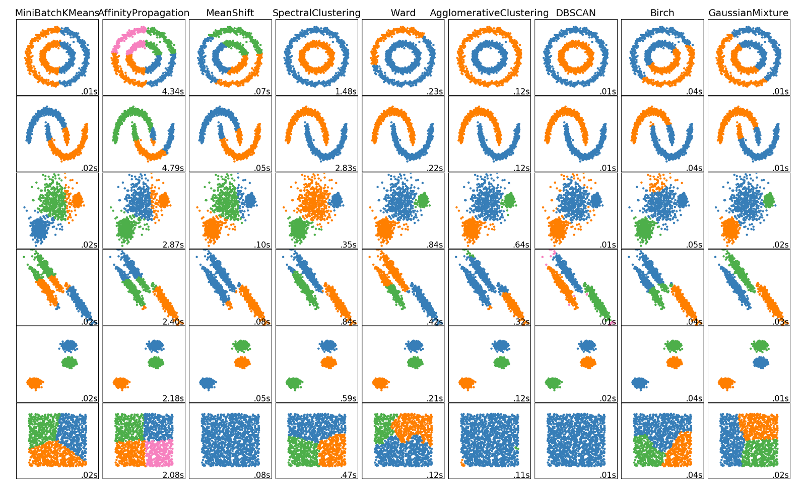 - 시간 복잡도가 다 다르기 때문에 가장 군집을 잘 나누면서 시간 복잡도가 가장 낮은 모델을 사용하는 것이 바람직하다.