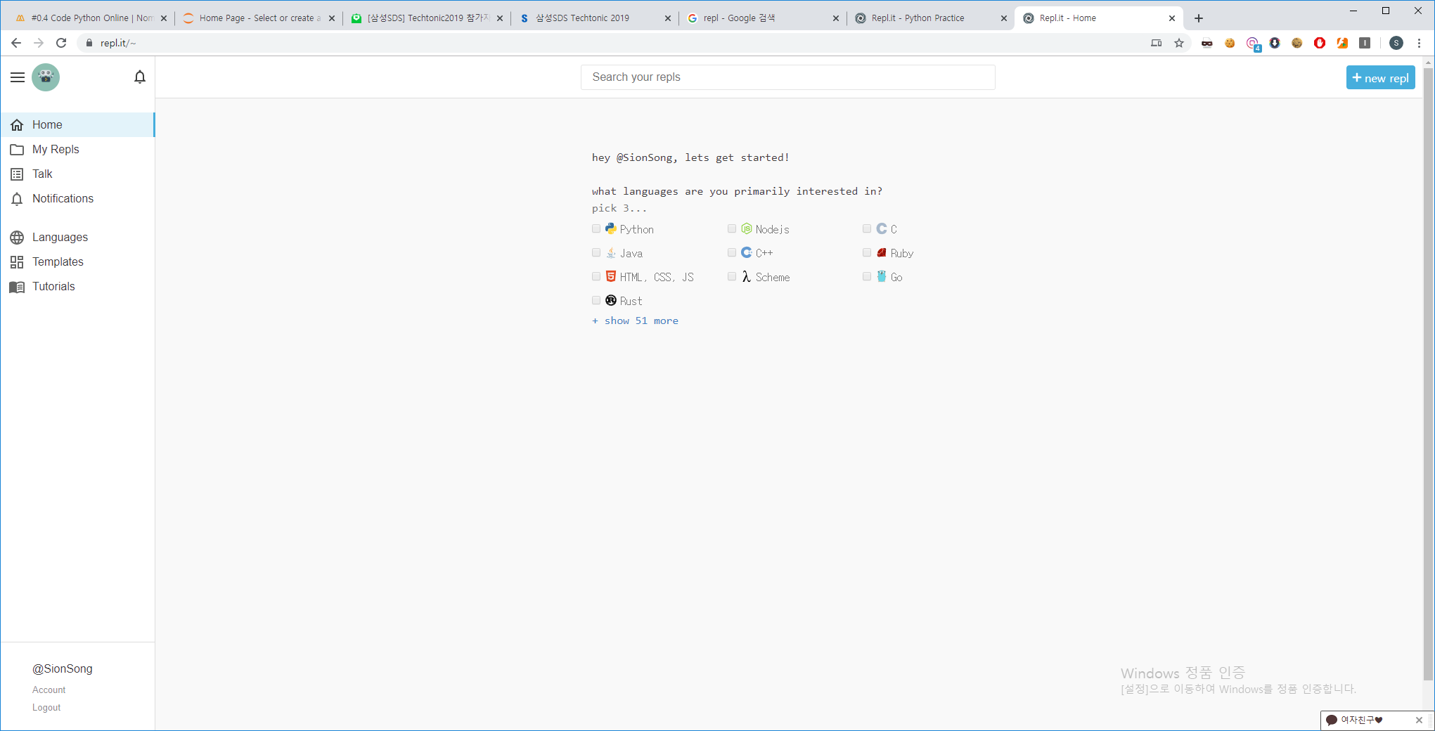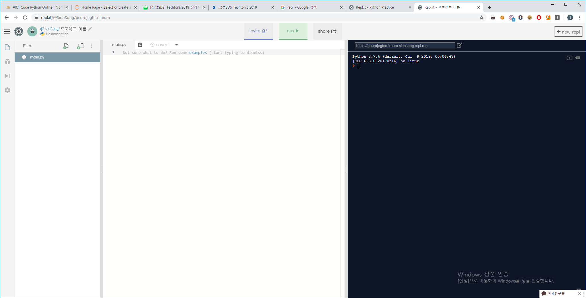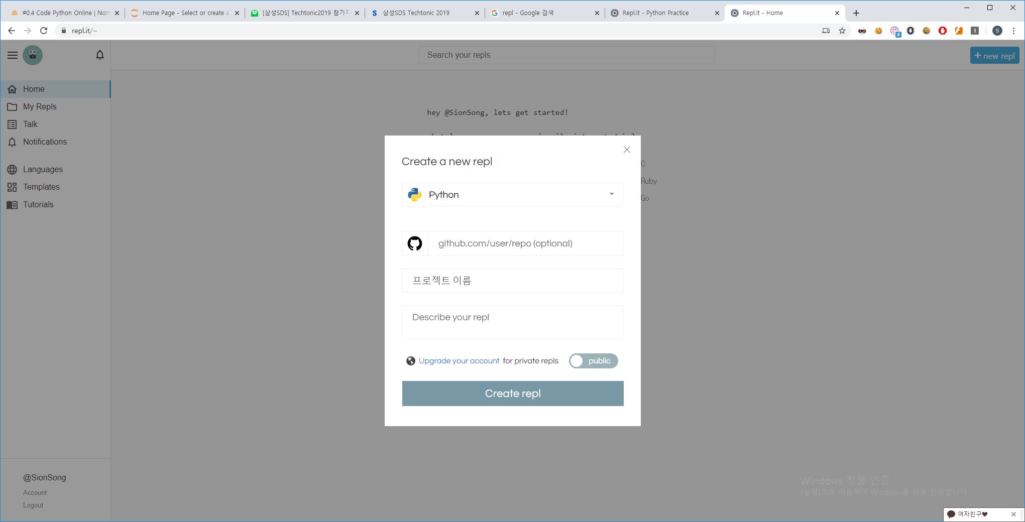 - 프로젝트 이름을 넣고 Create repl을 클릭