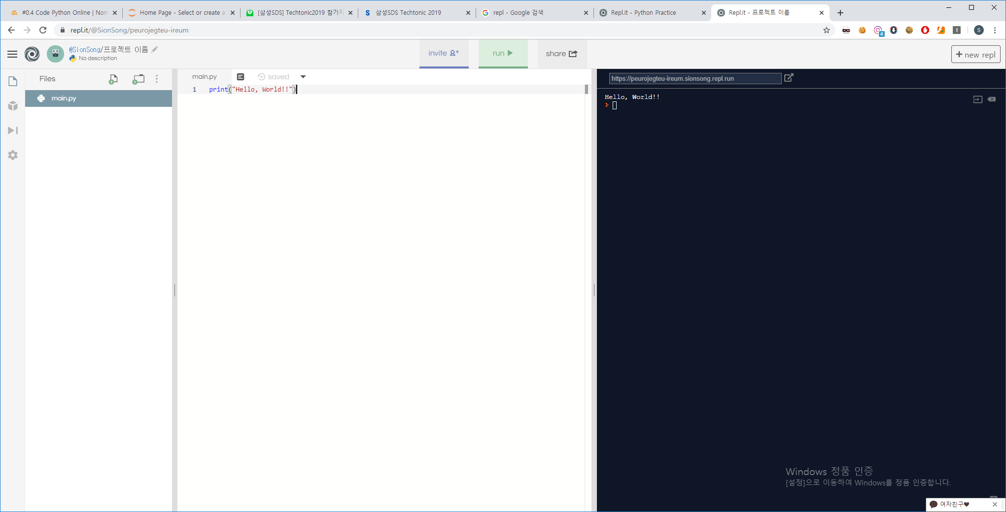 - main.py에 print("Hello, World!!") 를 적어주고 run을 하여 console에 출력되는지 확인한다.