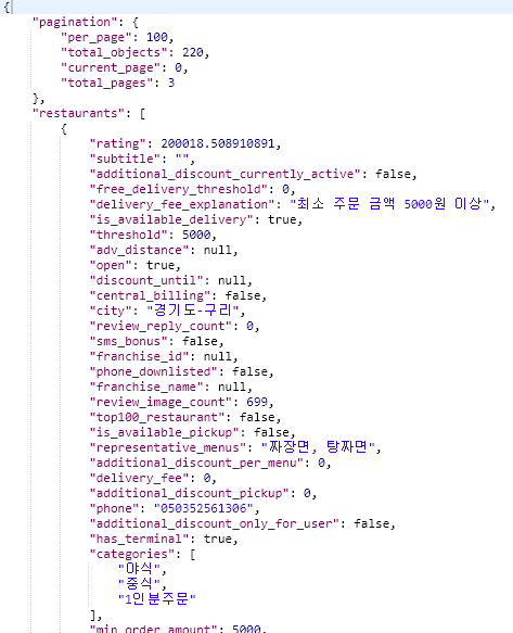 - 여기서 restaurants가 가게 정보임을 알 수 있고, JsonArray형태로 가게의 리스트가 나오는 것을 알 수 있다.