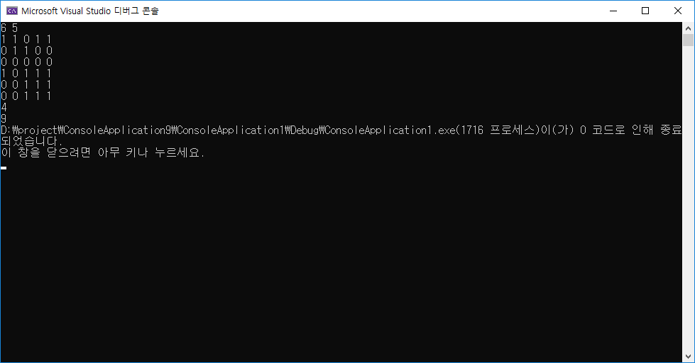 - 어떤 큰 도화지에 그림이 그려져 있을 때, 그 그림의 개수와, 그 그림 중 넓이가 가장 넓은 것의 넓이를 출력하여라. 단, 그림이라는 것은 1로 연결된 것을 한 그림이라고 정의하자. 가로나 세로로 연결된 것은 연결이 된 것이고 대각선으로 연결이 된 것은 떨어진 그림이다. 그림의 넓이란 그림에 포함된 1의 개수이다.