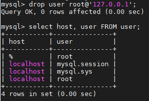 그렇다면 저 오류에서 나오는 127.0.0.1에 대한 유저를 지워주면 쉽게 해결됩니다.
