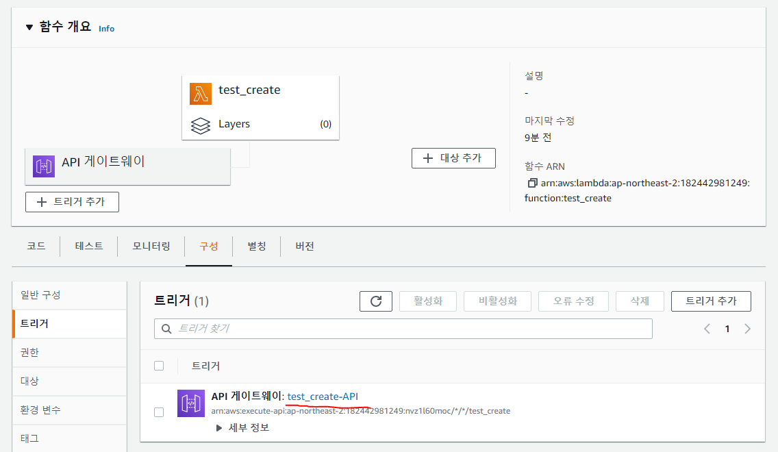 - API 게이트웨이가 잘 동작하는 지 확인하기 위해 트리거 > 생성된 트리거의 이름을 을 눌러줍니다.