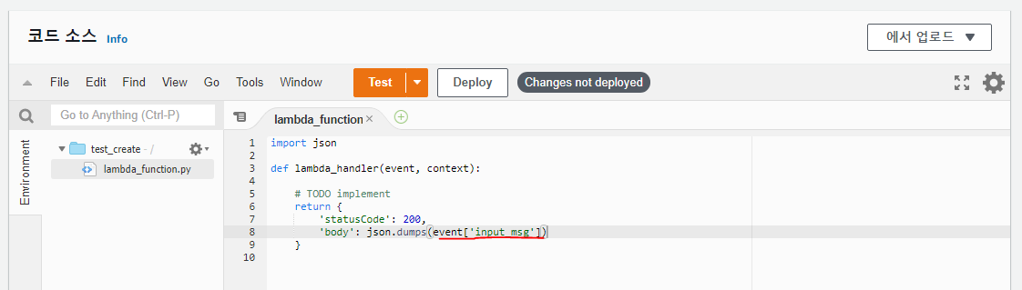 - 다시 함수 페이지로 이동해서 코드 소스에서 event['파라미터이름'] 을 body에 넣어줍니다.