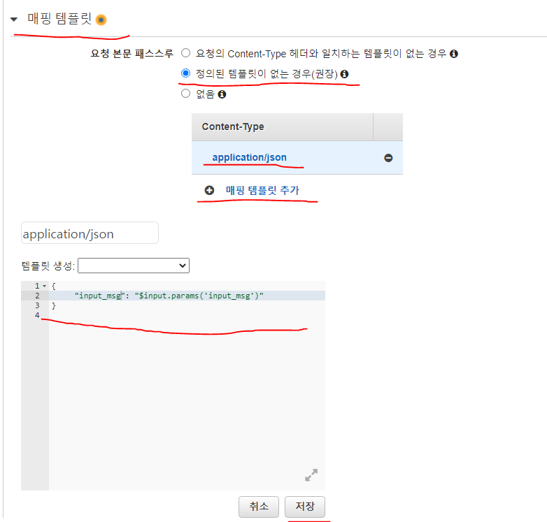 - 매핑 템플릿에 application/json 템플릿을 추가합니다.