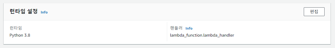 - 핸들러를 설정해주는데 기본적으로 처음 생성된 lambda_handler가 들어가 있기에 호출될 함수명을 바꾸고자 한다면 이부분을 수정해줍니다.