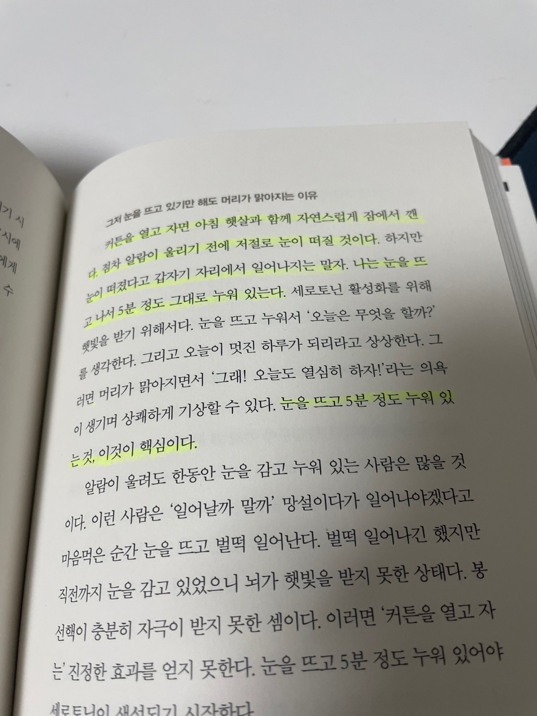 - 아침에 눈을 뜨고 5분간 햇빛을 눈에 채우면 세로토닌이 분비되어 하루의 업무 효율을 크게 늘려준다.