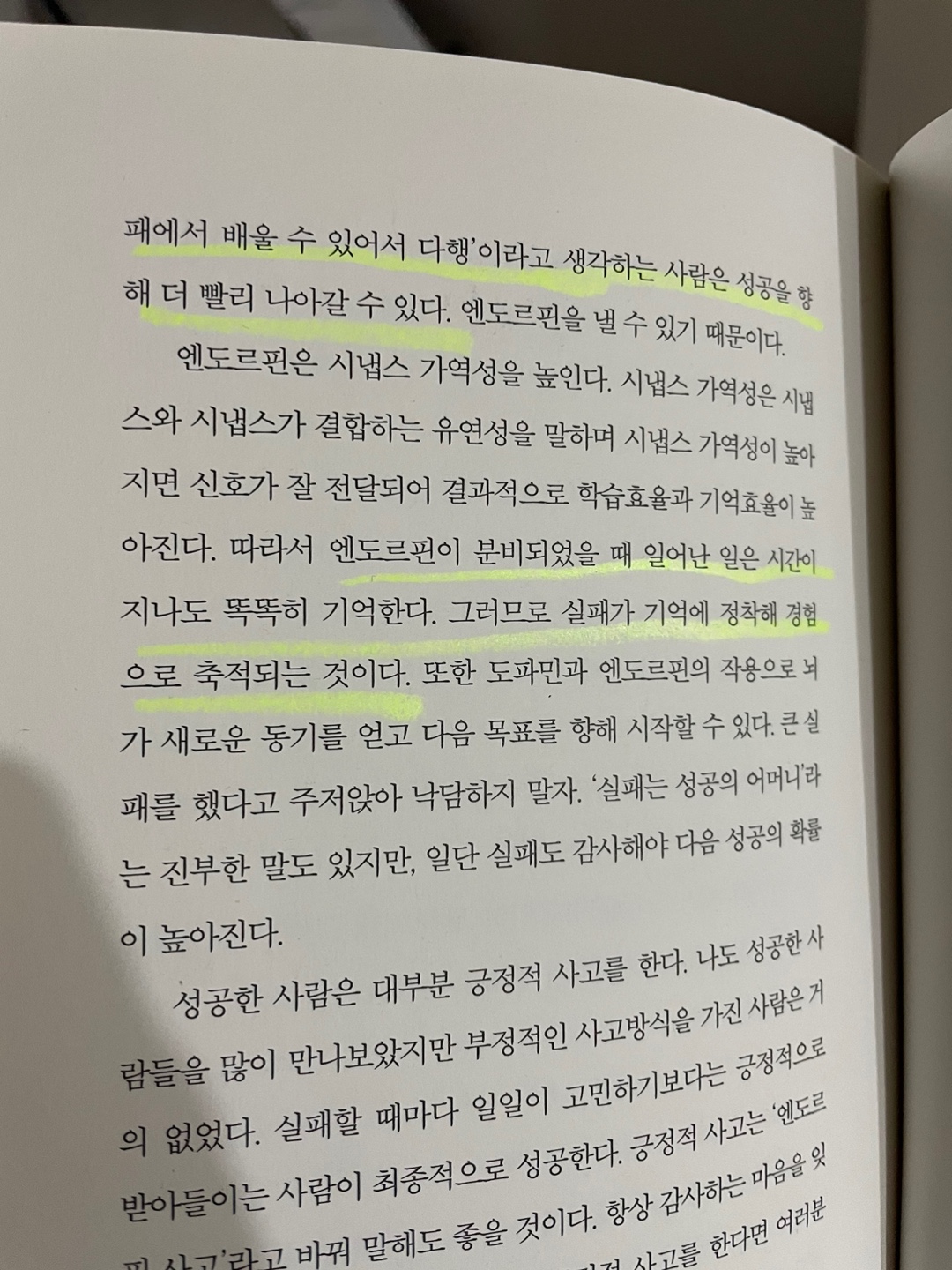 감사하는 사람이 성공하게 되는 이유는 실패에 감사를 느끼면 엔도르핀이 그 실패를 기억하게하고 실패에서 학습할 수 있게 된다.