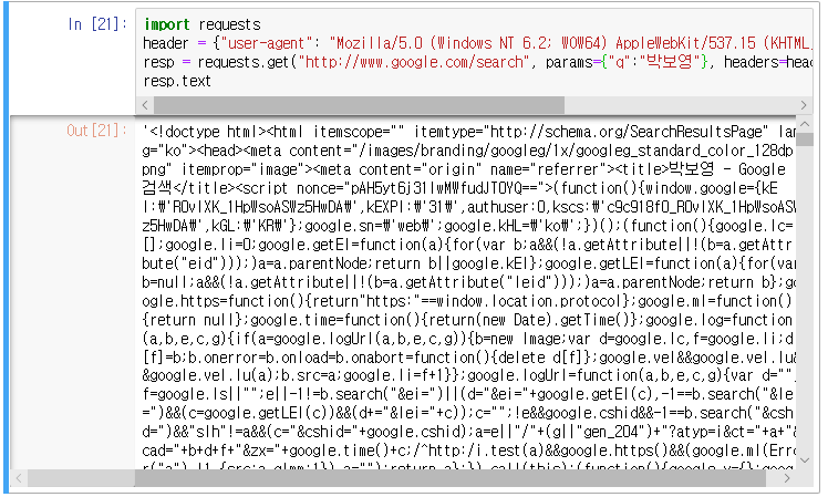 resp = requests.get("http://www.google.com/search", params={"q":"박보영"}, headers=header)