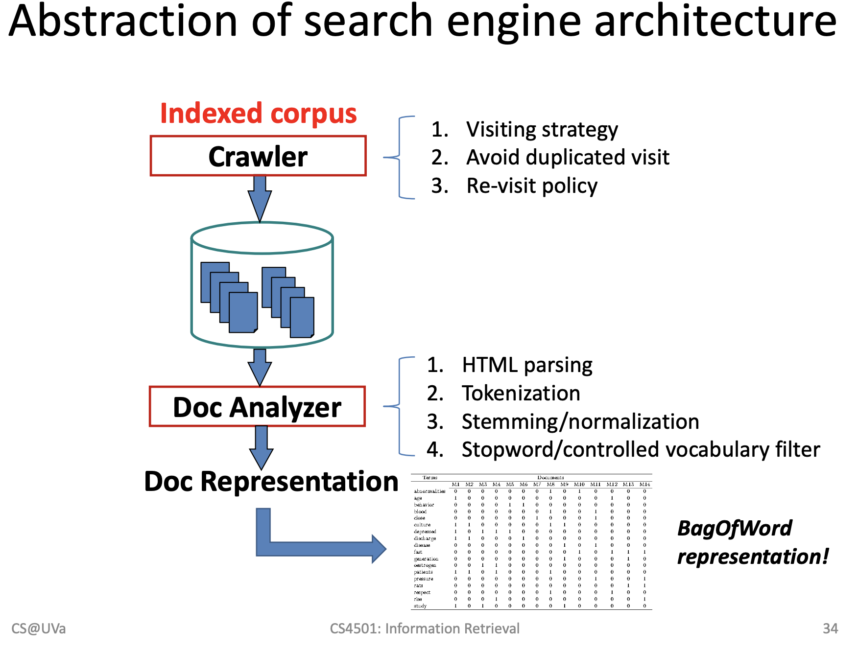 Crawler => Repository -> Doc Analyzer => Doc Representation -> Indexer => Index