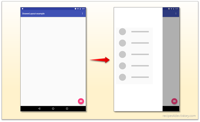 - DrawerLayout아래 같은 레이어의 자식을 생성하고 그 중 layout_gravity를 갖는 뷰가 사이드 메뉴가 된다.